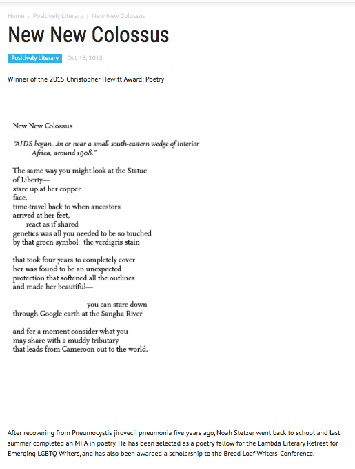 The award is named for Christopher Hewitt, who served as A&U’s first Literary Editor. Born in Worcestershire, England, Hewitt immigrated to the United States in 1974. His poems and translations appeared in The New Yorker, American Poetry Review, The Advocate, The James White Review, BENT, and in the anthology Queer Crips: Disabled Gay Men Tell Their Stories. At the time of his death in 2004 at the age of fifty-eight, he was working on a memoir titled “Brittle Bones,” in part about living with osteogenesis imperfect. (Wikipedia)
