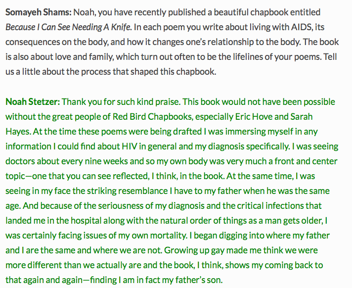 So you can imagine how delighted I was to have been approached a year later to be interviewed about my chapbook Because I Can See Needing a Knife (Red Bird Chapbooks, 2016). Many thanks to Somayeh Shams (a fellow Warren Wilson alum) and the good folks at Nimrod.